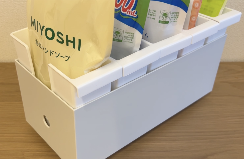 小物を仕分けて収納できるのはもちろん、ボトルなどが倒れるのを防止してくれたりと何かと便利な商品です。